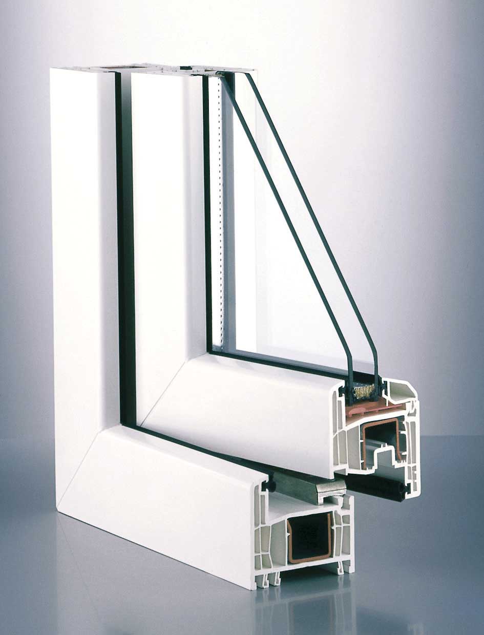 Das verwendete Konstruktionssystem basiert auf Mehrkammerprofilen aus gehärtetem Polyvinylchlorid (PVC) mit einer Baubreite von 62mm – 74 mm, die außerdem durch verzinkte Stahl- oder Aluminiumaussteifungen mit einer Wandstärke von 1,5 – 4 [mm] ausgesteift sein können. Die Verbindung erfolgt durch Schweißung bzw. Verschraubung. Neben der Grundfarbe weiß können auch coextrudierte Erzeugnisse in der RAL-Farbenskala bestellt werden oder Erzeugnisse in Holzfarben mit Folienprofilen.